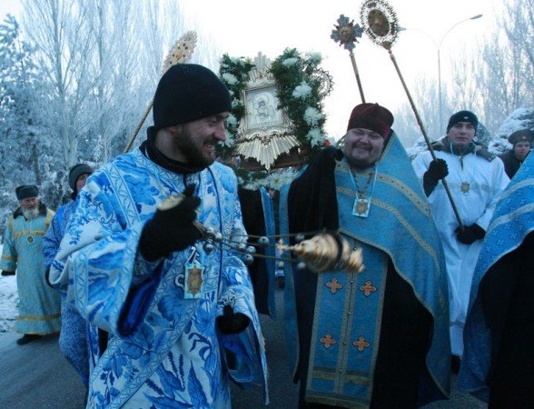 Несмотря на сильный мороз, автобусы с православными прибывали один за другим. Среди общей массы верующих мы заметили большое число казаков, одетых в свою форму. Как только икона оказалась на эстакаде, люди тут же потянулись к ней. А ровно в восемь утра начался Крестный ход до Воскресенского собора. Расстояние составляет примерно 30 километров, и чтобы преодолеть его, православным потребуется 5-6 часов.