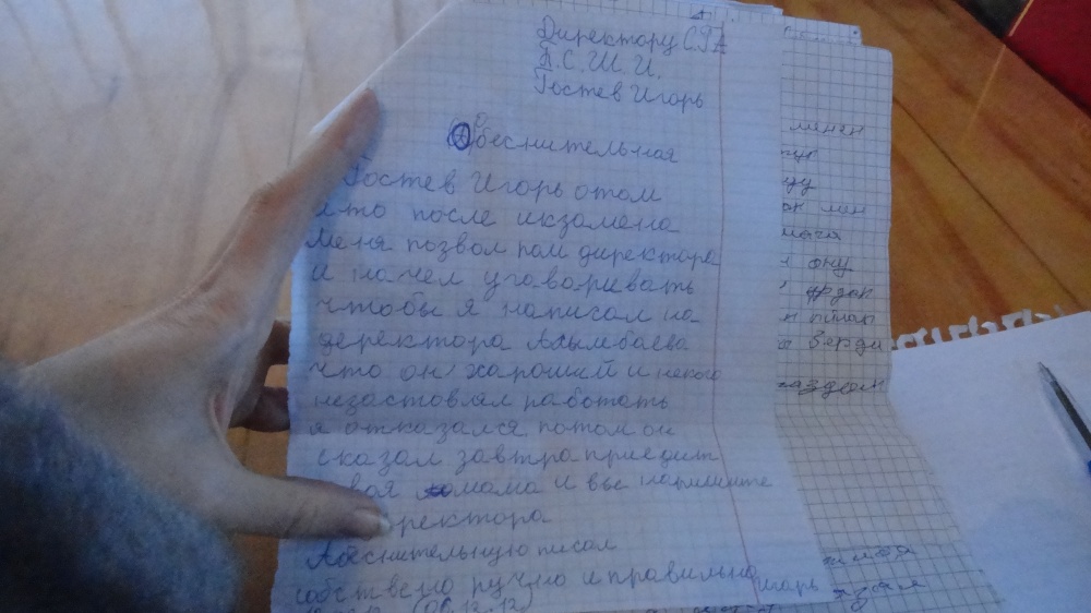 «Сегодня с утра помощник директора Санжи после завтрака ударил меня по голове замком. Я стал сидеть после того, как заболели ноги. Я болел», - пишет один из воспитанников спецшколы. «Санжи в пьяном виде стащил с кровати Адыла, Эсена и Амана и побил», - пишет другой. Приблизительно о том же рассказывалось и в остальных объяснительных.