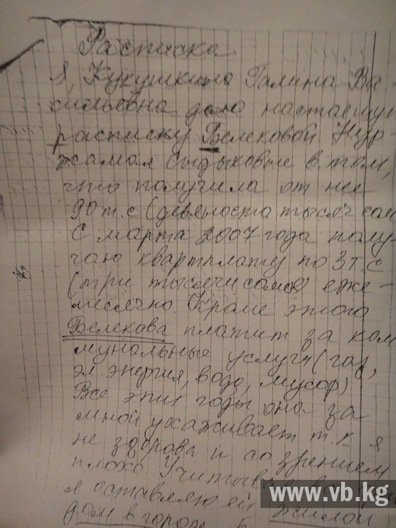 В 2007 году Галина Кукушкина - владелица дома по адресу: ул. Тоголока Молдо, 225 - сдала свою недвижимость в аренду Нуржамал Белековой за три тысячи сомов в месяц. 30 апреля 2010 года Кукушкина скончалась от инсульта. Незадолго до смерти она завещала дом троим соседкам - Валентине Романенко, Королевой и Рословой. Завещание, как и положено, оформил частный нотариус в присутствии свидетелей. Однако наследницы не смогли воспользоваться своей, как они были уверены, недвижимостью. Квартирантка Белекова и не собиралась освобождать жилплощадь. Более того, она показала пожилым женщинам расписку, где было сказано: "Я, Кукушкина Галина Васильевна, даю настоящую расписку Белековой Нуржамал в том, что получила от нее 90 тыс. сомов... Учитывая все это, я оставляю ей жилой дом в городе Бишкеке по улице Тоголока Молдо, 225. После получения от нее еще 60 тыс. сомов оформлю завещание через нотариальную контору на жилой дом по указанному адресу, так как некому больше оставить".