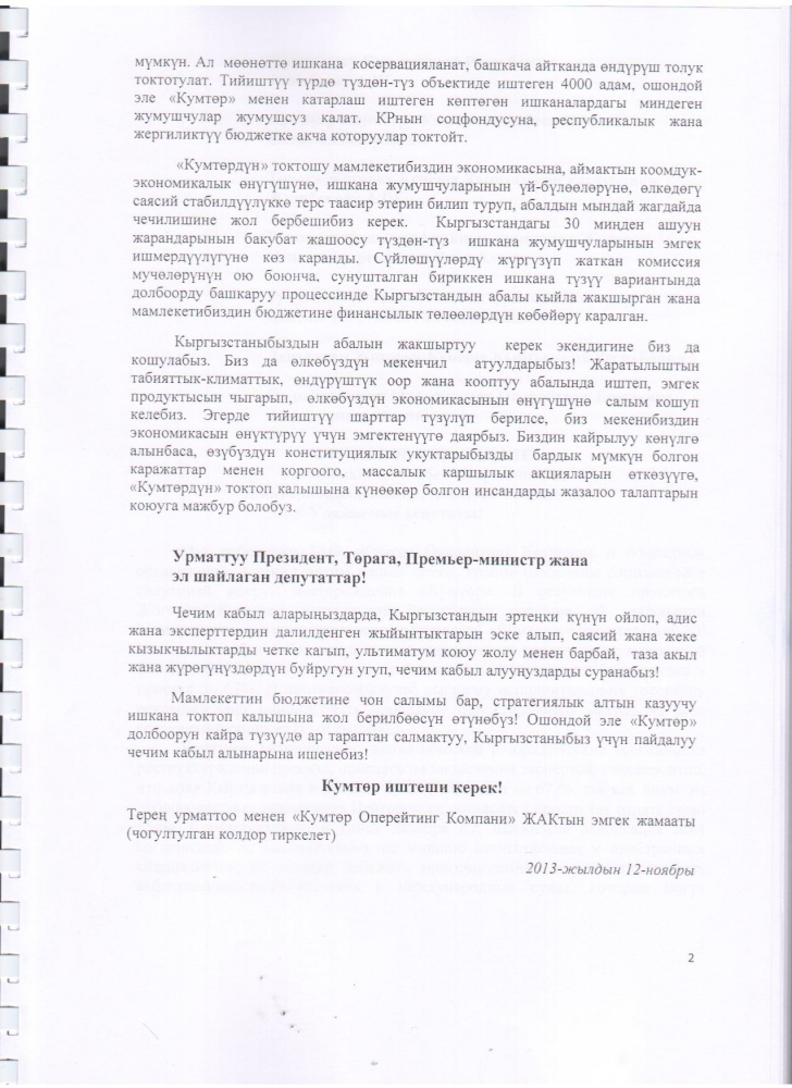 В обращении работники "Кумтора" просят высшие должностные лица, депутатов "отбросить личные амбиции, политические и частные интересы, не идти путем ультиматумов, а при принятии решений руководствоваться исключительно интересами Кыргызстана, обоснованными заключениями специалистов и экспертов, а также велением своего сердца и разума".