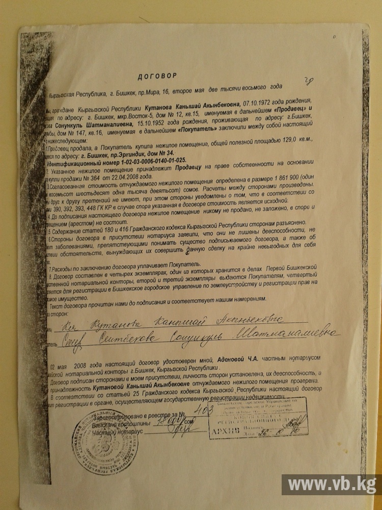 Но как только люди стали обращаться в соответствующие органы с просьбами о возврате, выяснилось, что подвал продан супруге главы горстата Сайфудина Сеитбекова. Причем договор купли-продажи оформлен не напрямую, а якобы через арендатора Канышай Кутанову, о которой жильцы в помине не слышали. Продавцом в договоре выступает доверенное лицо мэрии Тахир Бакиров. Последний занимает должность начальника отдела ведения реестра муниципального имущества УМС мэрии Бишкека.