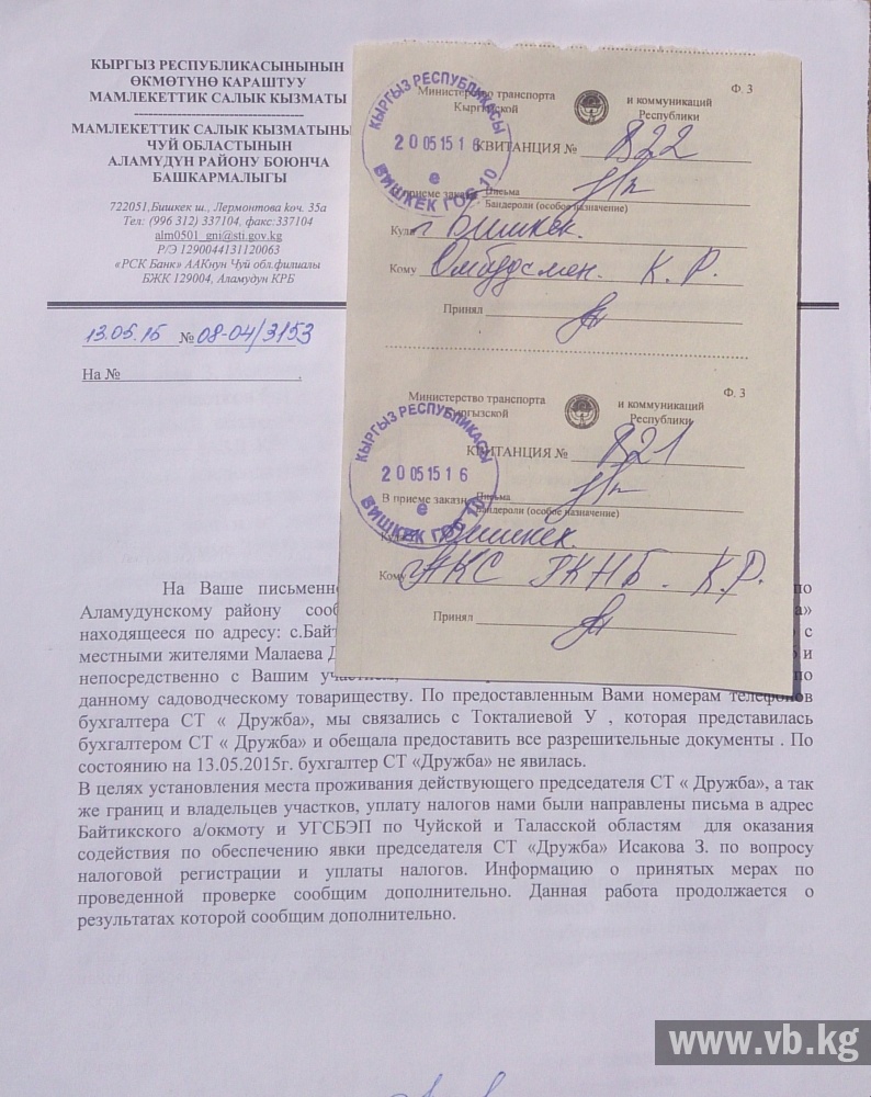 Дачники также рассказали, что 26 декабря 2014 года они обратились в УГНС Аламудунского района, но на заявление там до сих пор не отреагировали. После было еще много писем и заявлений в МВД, ГСБЭП, прокуратуру. "Наши заявления моментально исчезают или профильные органы начинают их перенаправлять друг другу, ссылаясь на свою некомпетентность в этом вопросе. Ответов мы так ниоткуда и не дождались", - говорят дачники.