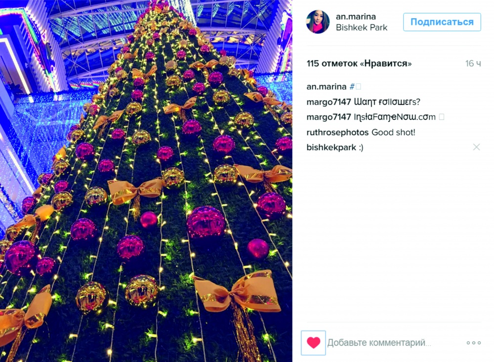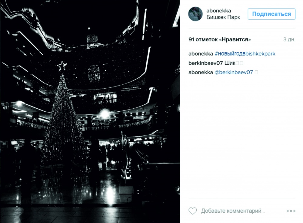 С середины декабря социальные сети пестрят фотографиями на фоне новогодних декораций с нарядными ёлками с хештегами #Newyear_soon #сновымгодом #скороновыйгод #новогоднеенастроение, и совсем недавно стал популярным тег #новыйгодвbishkekpark. Все дело в том, что популярный торговый центр запустил акцию, в финале которой самые красивые и интересные фотографии будут награждены подарками.