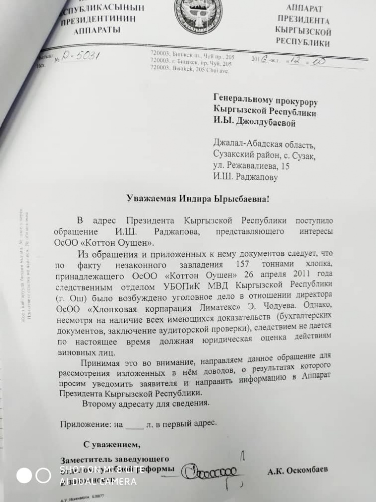 Исполнительный директор компании "Коттон Оушен" из Жалал-Абада Ибрагимова Замира обвиняет нынешнего министра сельского хозяйства Эркинбека Чодуева в присвоении миллиона доллара. Об этом редакции VB.KG заявила она сама.