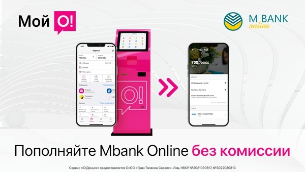 Кошелек "О!Деньги" в приложении "Мой О!" становится еще выгоднее и удобнее. Теперь пользователи сервиса могут пополнять Mbank Online и карточные счета "Коммерческого банка Кыргызстан" не только не выходя из дома, но и без комиссии. Кроме того, комиссия больше не взымается и при пополнение Mbank Online через платежные терминалы О!.